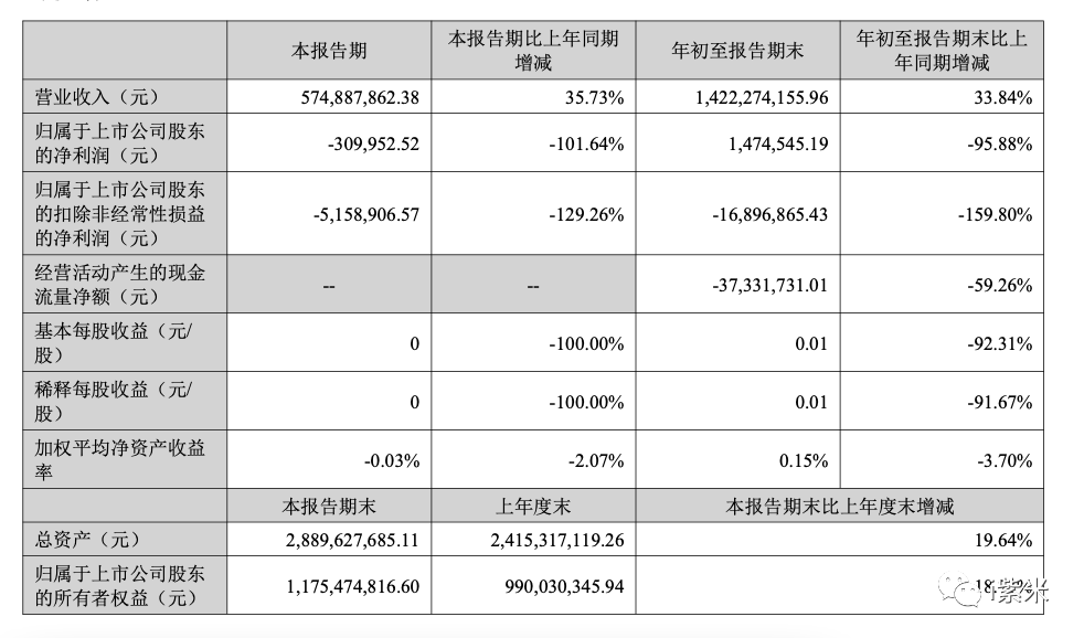 三季度报显示,前三季度公司营收14.22亿,同比增加33.84%,归属于上市公司股东的净利润147.45万元,同比减少95.88%。第三季度营收5.75亿,同比增加35.73%,归属于上市公司股东的净利润-31万,同比减少101.64%。
