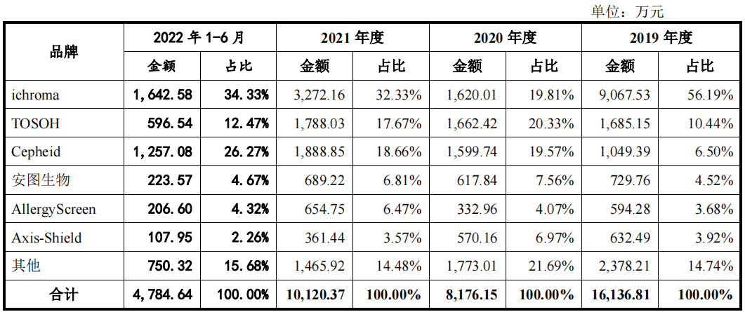 中翰生物的代理产品从2019年至2022年上半年,按照金额及总采购金额的占比来排列,分别是ichroma、TOSOH、Cepheid、安图生物、AllergyScreen、Axis-Shield等知名医疗器械品牌,其中ichroma是Boditech旗下品牌。即便是在2022年上半年,ichroma仍以34.33%的占比排第一。
