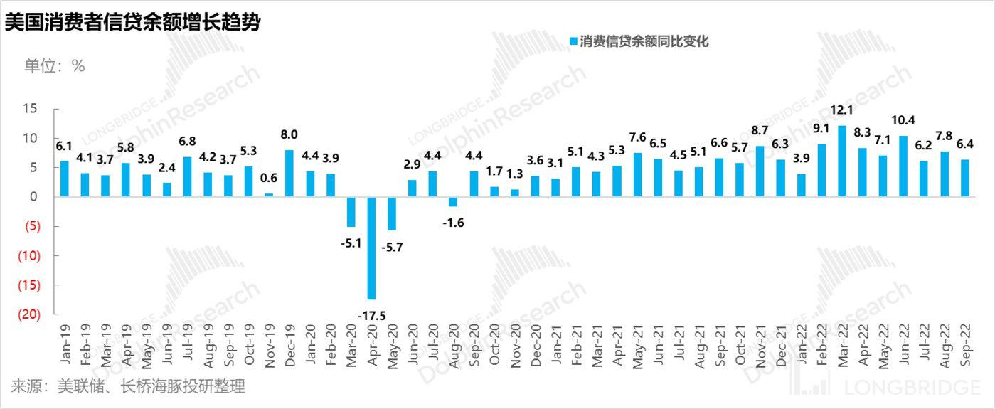 在看消费贷,美国的消费者贷款余额到 9 月底似乎并没有看到什么影响,还在稳定增长当中,消费贷的利率上涨程度虽然没有房贷飙涨得那么厉害,但 9 月消费贷款的综合年化利率已接近 22%,超过了疫情前的水平,在余粮耗尽的情况下,居民消费还能加多少杠杆需要打一个问题。