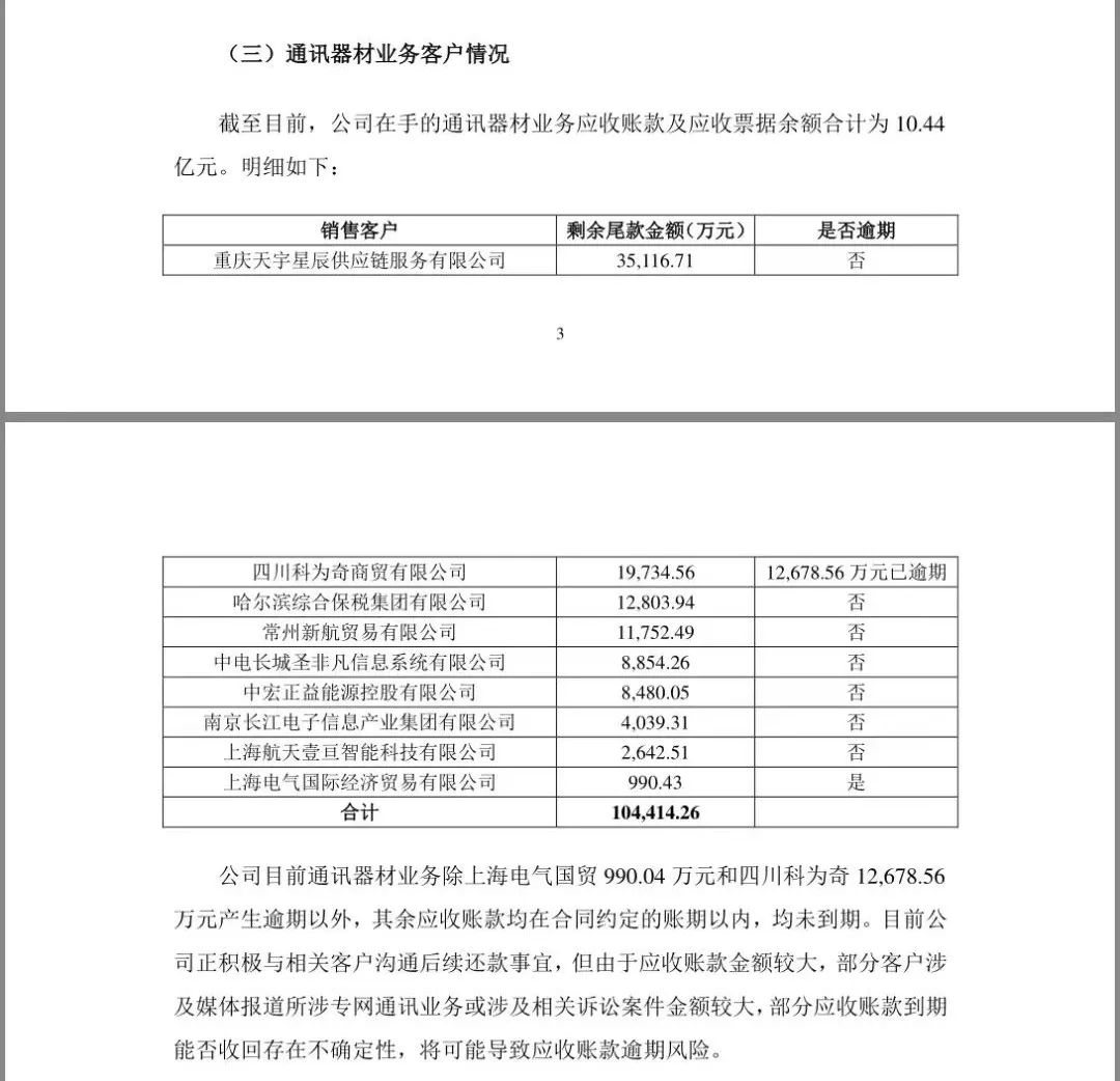 另外,江苏舜天面临的风险不止如此,除了这两笔逾期款外,彼时它共有10.44亿元的营收账款和票据,也都是通讯器材业务方面的,共涉及9家公司。虽然,当时大部分还未逾期,但也够呛能收回,因为这9家公司中,有多家被牵连进了专网通信案。