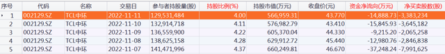 从成交均价和减仓股数来计算,TCL中环为本周北向资金减仓金额最大的个股,共被减仓1993.21万股,金额达9.02亿元。从明细数据来看,本周北向资金连续5个交易日减仓TCL中环,其中11月7日减仓超3亿元。