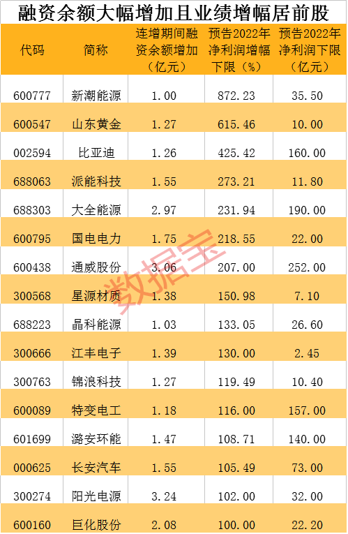 上述融资余额增加超亿元的个股中,有40股已披露2022年度净利润和净利润增幅均录得正值,其中16股净利润增幅下限超100%,五成为电力设备行业个股,包括派能科技、大全能源、通威股份、星源材质等。
