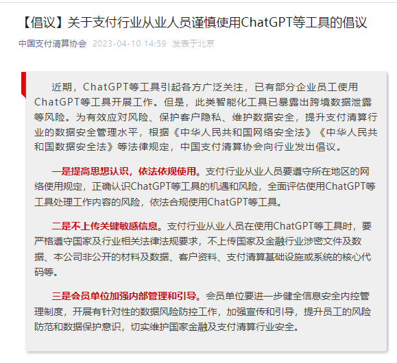 第四、A股盘后,中国支付清算协会10日发布《关于支付行业从业人员谨慎使用ChatGPT等工具的倡议》。其中提出,支付行业从业人员要遵守所在地区的网络使用规定,正确认识ChatGPT等工具的机遇和风险,全面评估使用ChatGPT等工具处理工作内容的风险,依法合规使用ChatGPT等工具。支付行业从业人员在使用ChatGPT等工具时,要严格遵守国家及行业相关法律法规要求,不上传国家及金融行业涉密文件及数据、本公司非公开的材料及数据、客户资料、支付清算基础设施或系统的核心代码等。