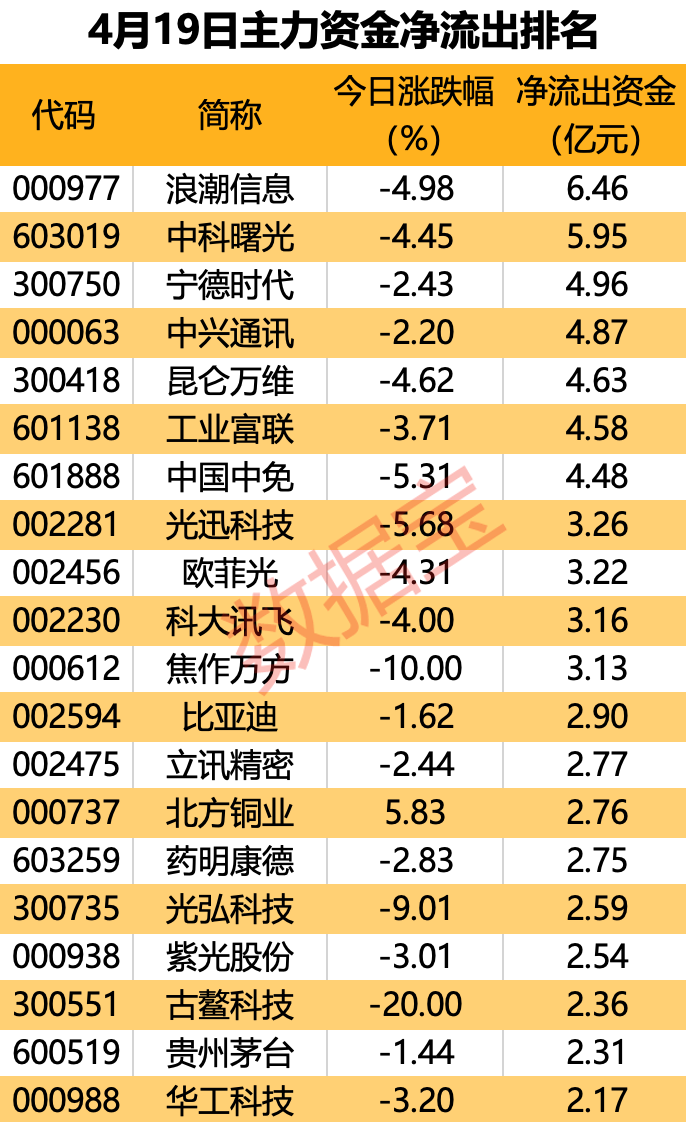 浪潮信息主力资金净流出金额居首,达6.46亿元。中科曙光净流出5.95亿元,居次席。还有宁德时代、中兴通讯、昆仑万维、工业富联、中国中免等市场龙头股主力资金净流出金额居前。