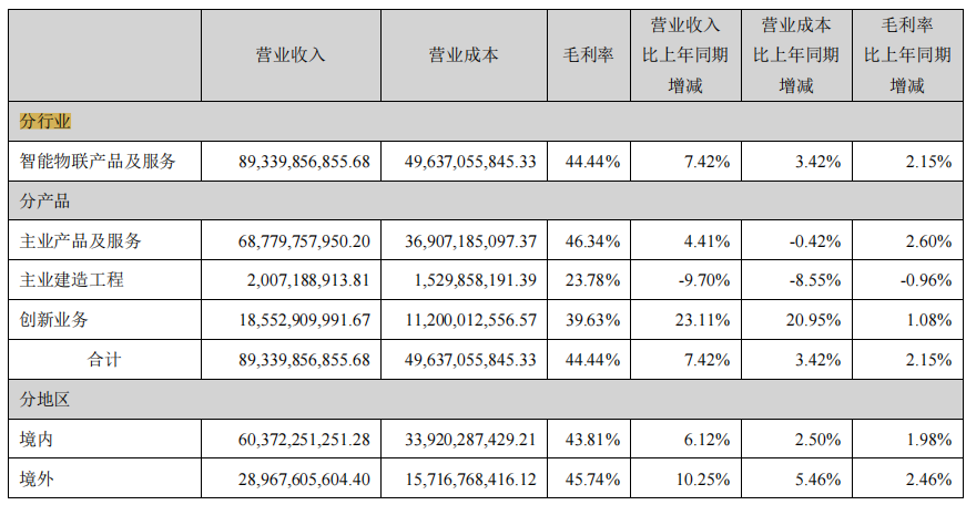 除此之外,分行业看,智能物联产品及服务的毛利率为44.44%,同比增长2.15%。