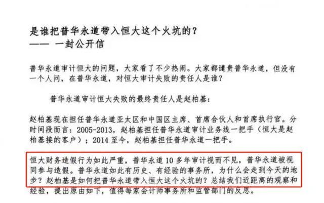 近日,一封标题为“是谁把普华永道带入恒大这个火坑”的公开信在市场上不断发酵,落款为“一部分普华永道合伙人”,信中揭露了普华永道内部审计质量管理等问题。