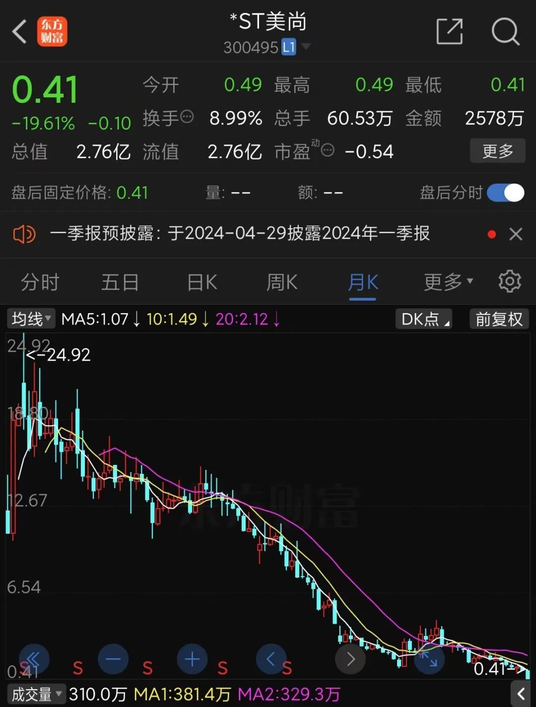 二级市场方面,*ST美尚股价近期加速下挫,截至4月19日股票收盘价已连续十个交易日低于1元,或存在因股价低于面值被终止上市的风险。
