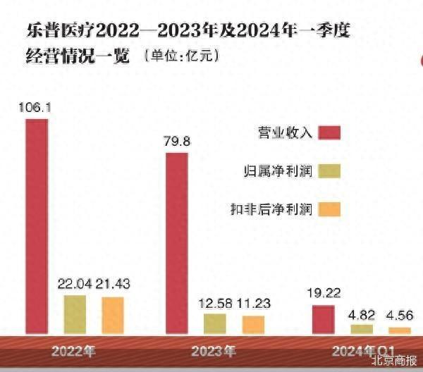 2023年及2024年一季度,乐普医疗营收、净利出现双降。财务数据显示,2023年,乐普医疗实现营业收入约为79.8亿元,同比下降24.78%;对应实现的归属净利润约为12.58亿元,同比下降42.91%;对应实现的扣非后净利润约为11.23亿元,同比下降47.6%。