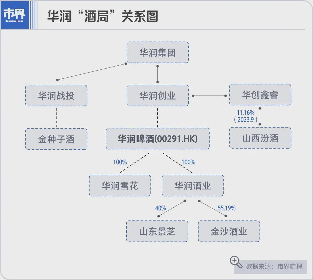 在白酒行业,华润集团通过旗下公司陆续控股及参股了山西汾酒、山东景芝、金种子酒、金沙酒业。其中,上市公司华润啤酒就间接参股及控股了两家——山东景芝、金沙酒业