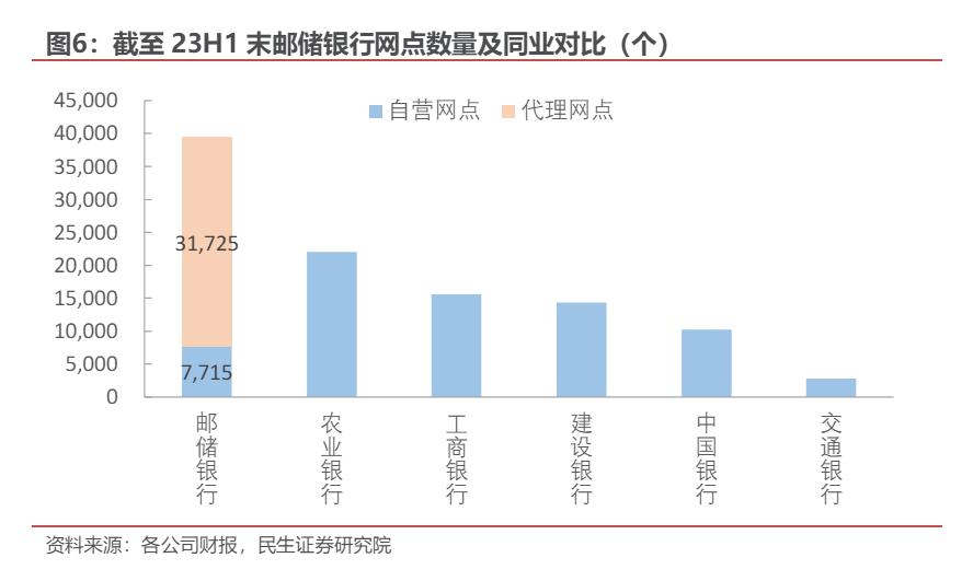 别看是最年轻的大行,邮储银行的网点数量远远超过其他同业,且下沉到县域乡村。截至2023年中,邮储银行总网点数达到惊人的39440个,其中代理网点占比为80%,遥遥领先于其他大行。这一数字在2023年末微降至39364个。