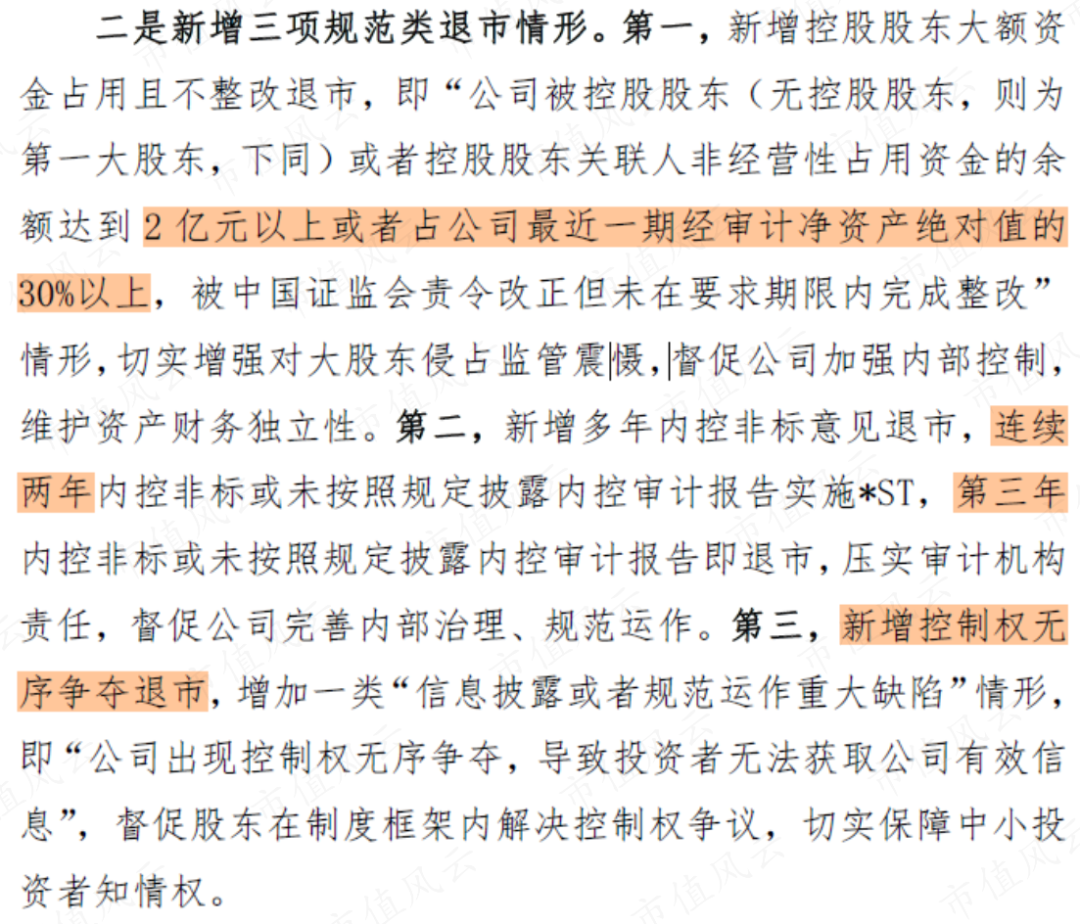 一是,控股股东大额资金占用且不整改退市,需要余额达到2亿元以上或者占公司最近一期经审计净资产绝对值的30%以上,且在证监会责令整改期内未完成整改。 二是多年内控非标意见退市,连续两年被“*ST”带帽,连续三年则直接退市。 三是,控制权无序争夺退市。