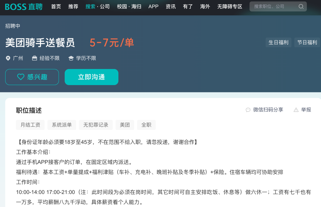 随后公司辟谣称,只要年龄在18岁到57岁,都可以申请成为美团骑手,没有45岁停止派单这一说法。不过最近,网易财经ESG在某招聘网站上查看美团骑手招聘的信息时发现,广州招聘目前仍显示骑手年龄不能超过45岁。