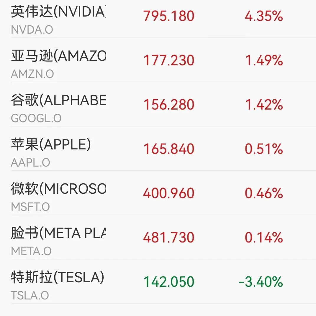 英伟达反弹超4%,领涨大型科技股,市值一夜大涨超约830亿美元(约合人民币6017亿元);特斯拉“七连跌”,收盘跌超3%,追平IPO以来连跌纪录,创2023年1月以来新低。