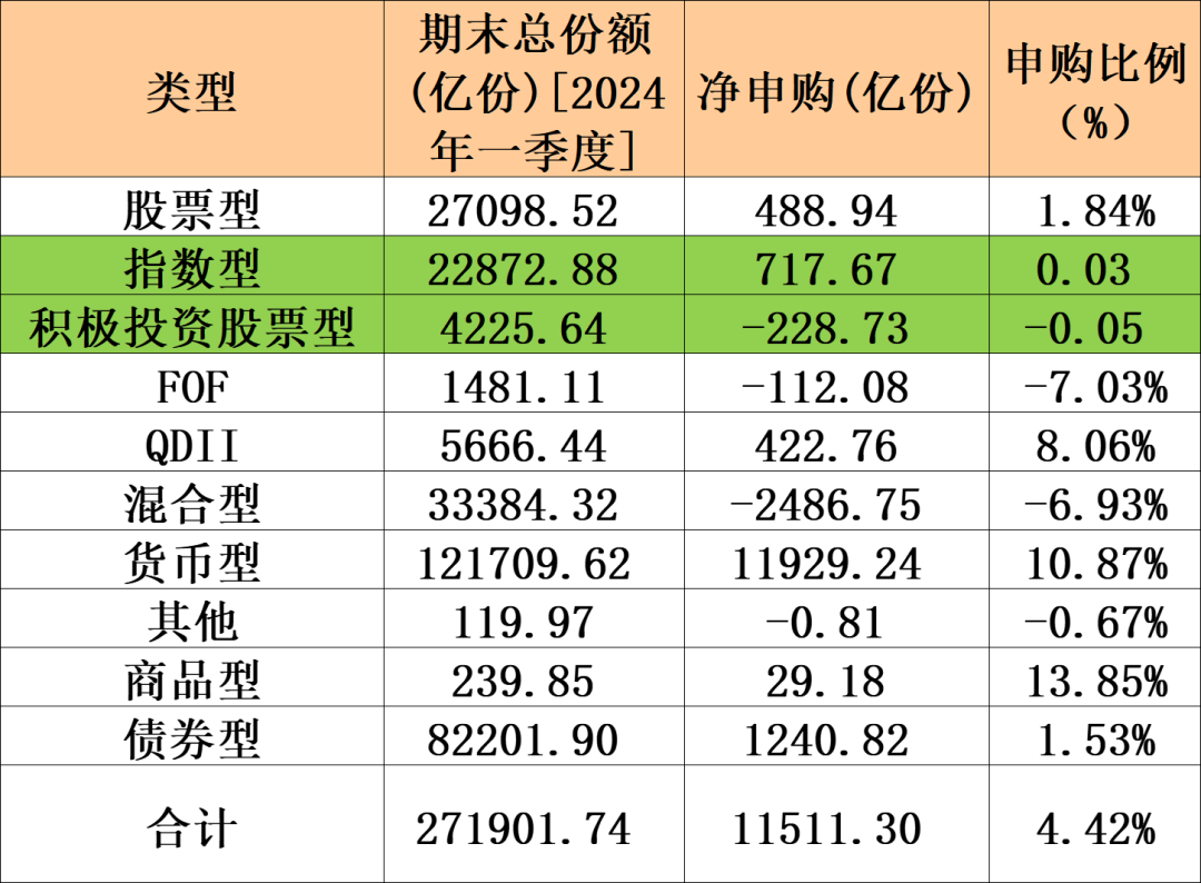 天相投顾数据显示,截至2024年一季度末,各类型基金(含联接基金)期末总份额为27.19万亿份,比去年底增加1.15万亿份,增幅为4.61%。货币型基金获最大净申购。