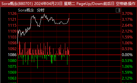 人工智能概念早间集体走强,其中Sora概念放量高开高走,板块指数盘中大涨一度近4%,半日成交超昨日全天成交,ChatGPT概念、多模态AI、AIGC概念、虚拟现实等相关板块亦强势上攻,安诺其、开元教育、德必集团等涨停或涨超10%。