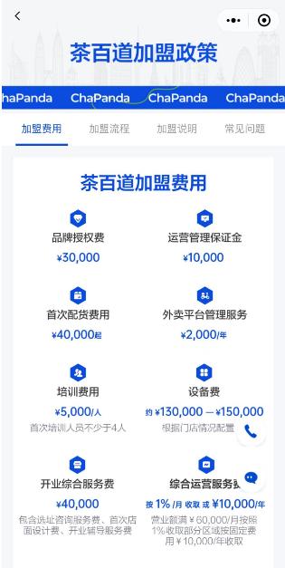 根茶百道微信公众号公布的加盟政策显示,加盟费用主要包括品牌授权费、设备、培训费、首次配货费用、开业综合服务费等,林林总总加起来至少需要28.2万元。值得注意的是,这个价格并不包含店租、水电、装修、人工工资等,外卖平台管理费用及综合运营服务费用还需要按年或按月上缴。如果闭店不干了,茶百道官方可以退还的仅有1万元保证金。