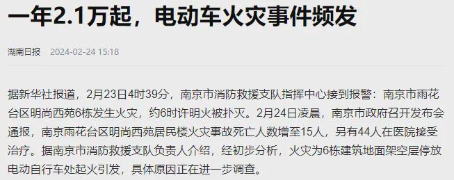 应急管理部数据显示,2018年电动车火灾事故为3000多起,2019年、2020年未公布数据,但2021年已经到了1.5万起,三年时间增加了5倍。2022年为1.8万起,2023年为2.1万起,每年火灾事故的增幅超过2位数。