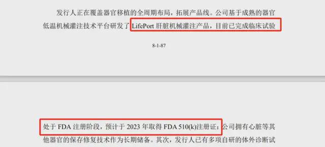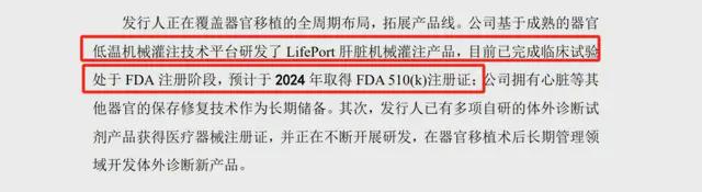 不过,早在2020年,健耕医药首次申报科创板上市时,其在向上交所递交的申报材料中提及其产品情况时便称,其低温机械灌注技术平台的新产品——LifePort 肝脏灌注运转箱及配套耗材产品已处在申请美国 FDA 认证的临床阶段。
