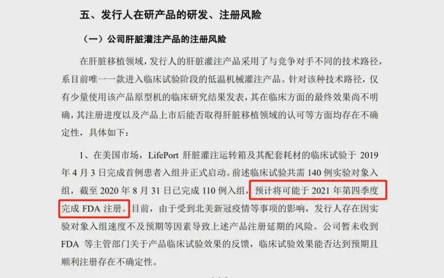 2020年,健耕医药首次申报科创板IPO时,其就在申报材料中明确写道“基于低温机械灌注技术平台开发的 LifePort 肝脏灌注运转器目前该处于申请美国 FDA 认证的临床试验阶段。2019年4月,首例患者正式入组,截至 2020年8月 31 日已入组 110 例,预计将可能于 2021 年第四季度完成 FDA 注册”。