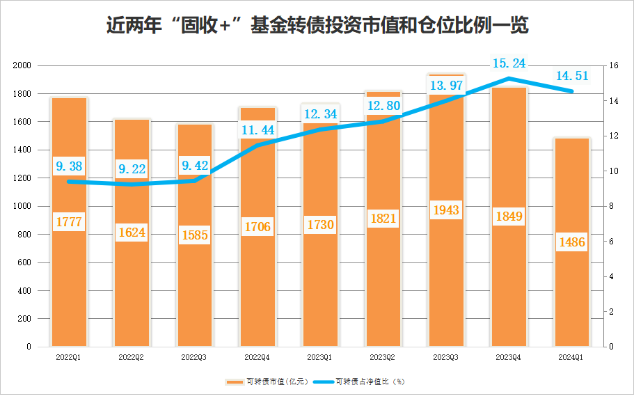 Wind数据显示,截至2024年一季度末,“固收+”基金(统计偏债混合和二级债基)持有可转债市值1486亿元,单季度持有市值减少363亿元,萎缩近20%。