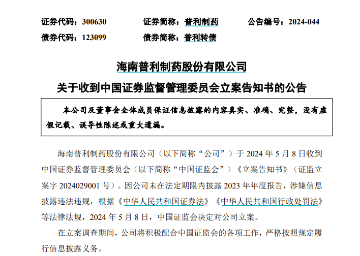 普利制药发布的公告显示,公司于5月8日收到中国证监会《立案告知书》。因公司未在法定期限内披露2023年年度报告,涉嫌信息披露违法违规,根据《中华人民共和国证券法》《中华人民共和国行政处罚法》等法律法规,2024年5月8日,中国证监会决定对公司立案