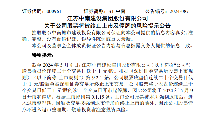 早在4月26日,ST中南已经因为股价低于一元时间太久,无法在20个交易日内回到一元之上,而锁定退市。