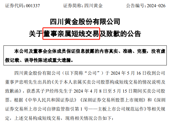 5月16日晚间,四川黄金公告称,董事尹忠明之子尹经纬4月8日至5月15日买卖公司股票,构成短线交易,当前处于亏损状态。