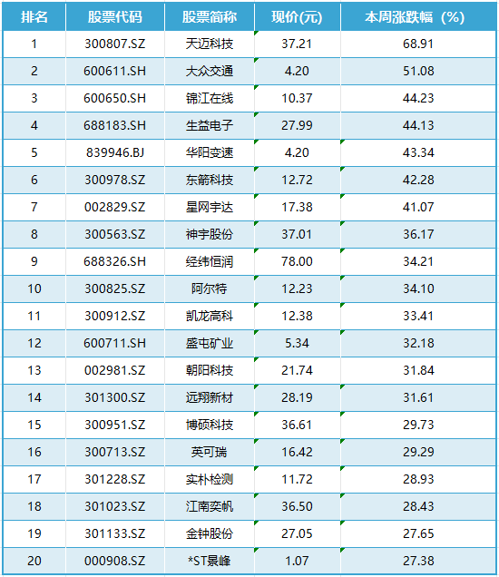 iFinD数据显示,本周排在上市公司涨幅榜前十名的分别是天迈科技、大众交通、锦江在线、生益电子、华阳变速、东箭科技、星网宇达、神宇股份、经纬恒润、阿尔特。