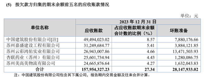 数据显示,2023年 建院股份的应收账款规模4.82亿元,应收账款周转率1.14次,按照欠款方归集来看,2023年的第一大应收账款方为中国建筑(包含其下属公司),金额4949.4万元。