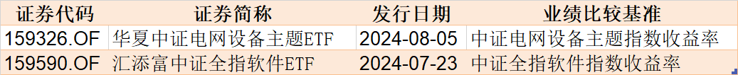 目前有1只ETF披露下周发行,跟踪标的为中证全指软件,此外还有1只跟踪电网设备主题的ETF将于8月初上市。
