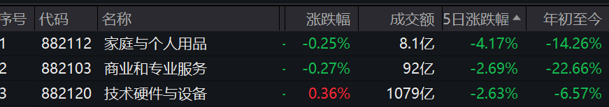 领跌板块,家庭与个人用品、商业和专业服务表现不佳。